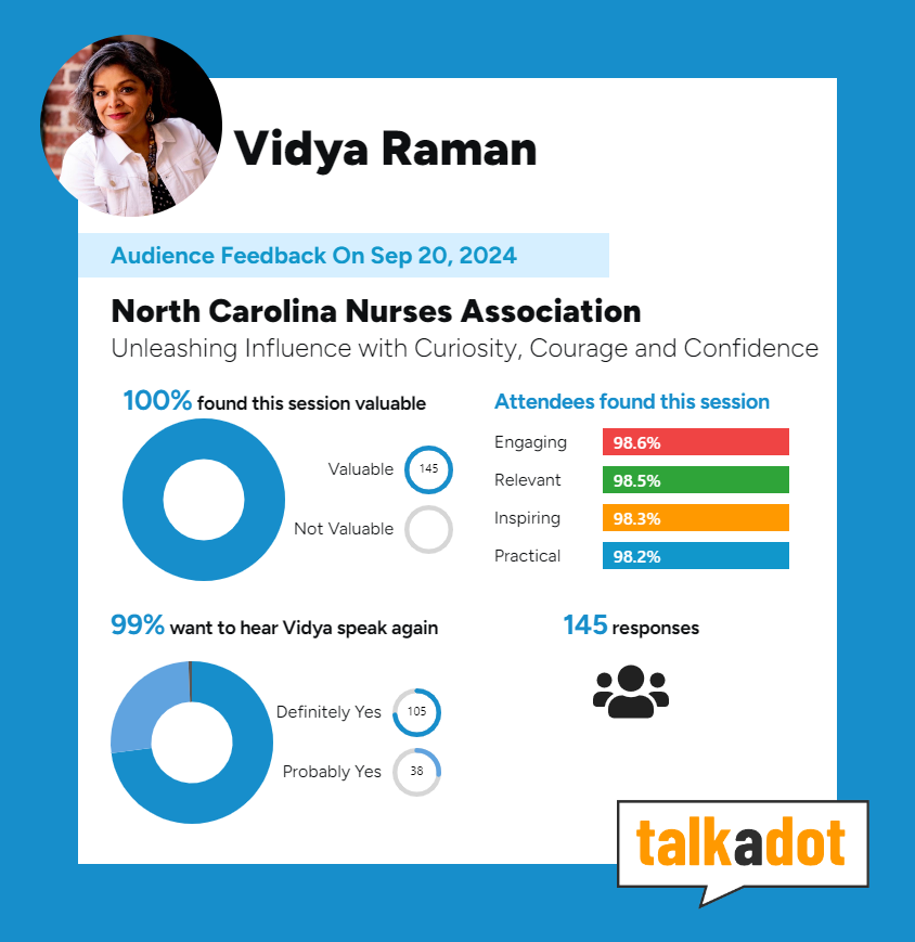 What sets Vidya apart is her ability to break through and connect deeply to leave a lasting impact. Insightful, practical, and fun are how attendees describe my presentations.